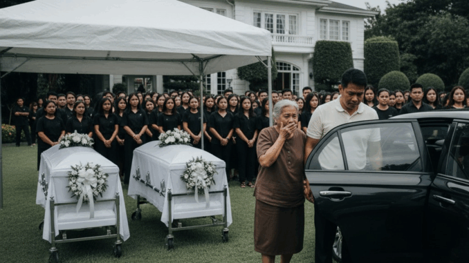 In the center of the courtyard, two coffins had been placed side by side, covered with white cloths and garlands of marigolds; incense smoke rose from the altar, and the mournful sound of a funeral trumpet resounded.