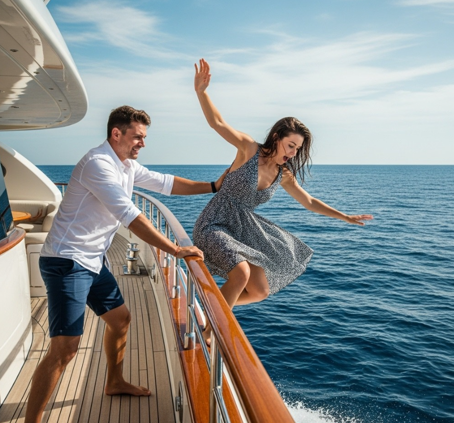 Olivier remained motionless, his gaze fixed on the spot where she had disappeared. Her scream had been only a fleeting echo, drowned out by the roar of the sea and the abyss around him. He didn’t throw a ball, he didn’t call for help, he didn’t cry. He took out his phone, took a deep breath, and dialed a number. “This is Captain Olivier,” he said in a trembling voice. “My wife.” He slipped, fell over the side, let his voice crack, and fell to his knees, clutching the edge of the boat. There were no tears, only a contained silence, a calculated act, and the soft ticking of his luxury watch.