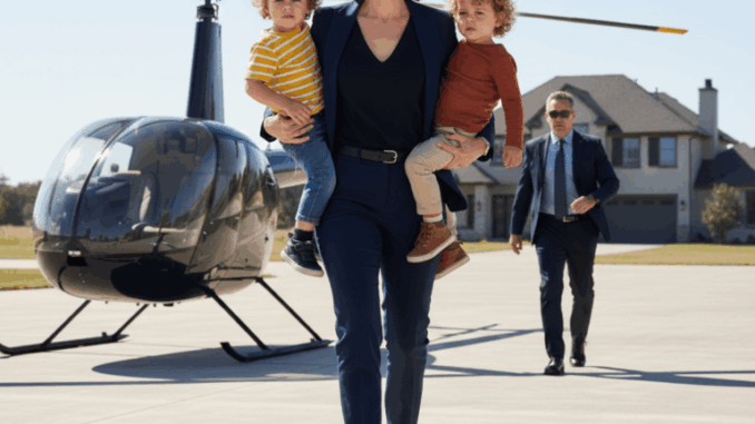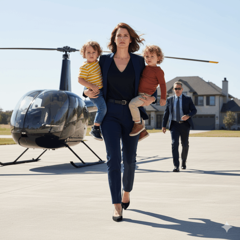 The sudden buzz of helicopter blades silenced the crowd. Heads turned as Emily stepped out, her heels clicking on the stone driveway. The twins followed, holding her hands. She walked with calm confidence, her assistant trailing discreetly with a camera crew filming for a women-in-leadership documentary.