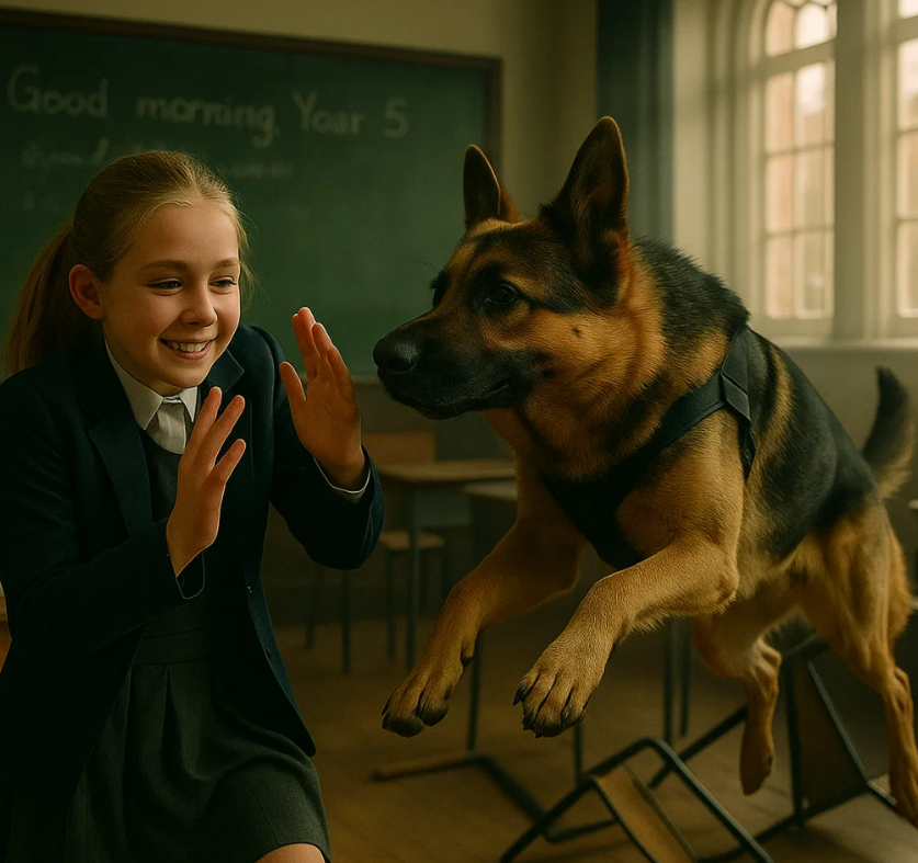 The German Shepherd lunged at a girl in the third row, barking loudly. She was a modest, quiet student named Marie—she usually sat in the back rows. Today, she stood next to her friends, holding a notebook against her chest. At first glance, she looked like an ordinary, shy girl.