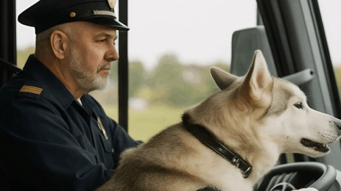 A uniformed police officer was sitting on a city bus. Next to him, on the front seat, calmly sat his loyal service dog – a smart husky. For the passengers, this was already a familiar sight: the dog didn’t bother anyone, quietly looked out the window, observed the passing scenery, and seemed to enjoy the calm ride.