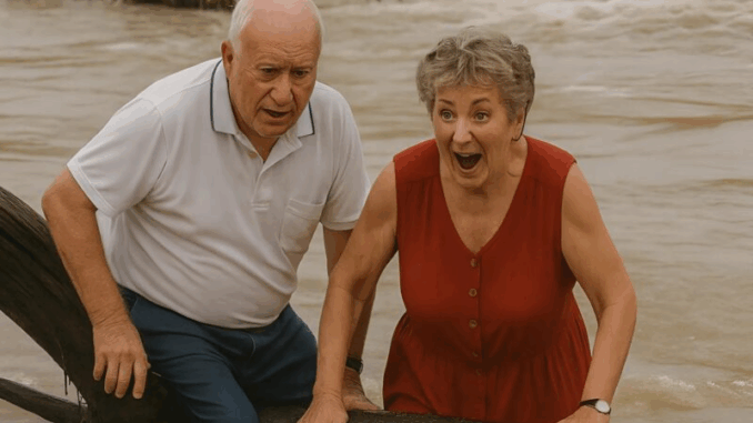 The couple sat there, trembling from fear and cold, but alive. The elephant confidently moved toward the shore, cutting through the raging waters with its massive body. With each step it became like a saving island to them.