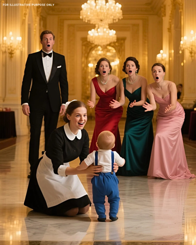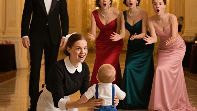 With wobbling determination, he walked past their jeweled arms and elegant gowns, heading toward the corner where Emily, the young maid, knelt quietly, gathering toys. She froze, eyes wide, as Ethan fell into her arms, clinging to her uniform with complete trust.