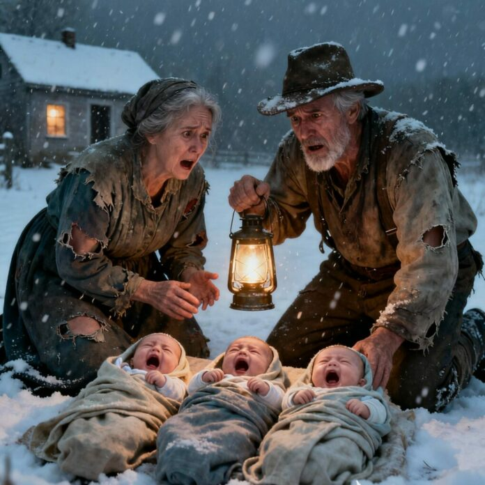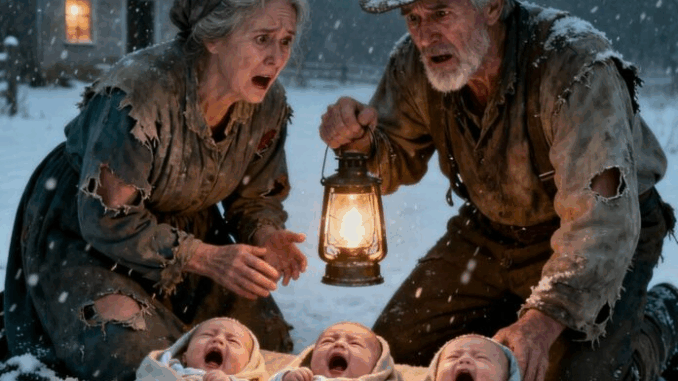 Mark grabbed his coat and flashlight, stepping into the freezing storm. The light cut through the snow in shaky beams until it landed on a small wicker basket beside their gate. Ellen rushed out behind him, heart pounding. Inside the basket were three newborns, wrapped in thin blankets already damp from snow. Their tiny faces were red and trembling.