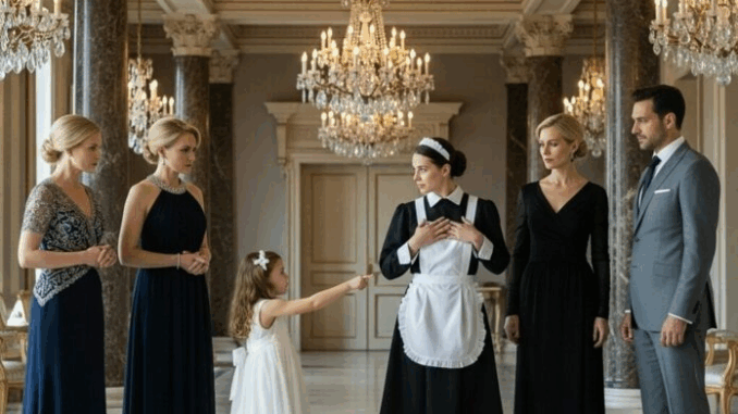 That’s when Lena Harper, a maid in her late twenties, appeared quietly with a tray of lemonade. She wasn’t meant to be there; her shift had ended, but she saw Sophie hiding behind a pillar and gently said, “Would you like some juice, sweetheart? You look thirsty.”