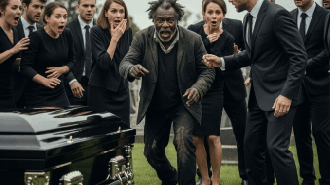 The shout cut through the solemn silence of the cemetery. Mourners froze mid-breath as a disheveled man pushed his way to the front. His coat was torn, his shoes mismatched, and his face bore the marks of years on the street. Yet his voice carried with startling conviction.