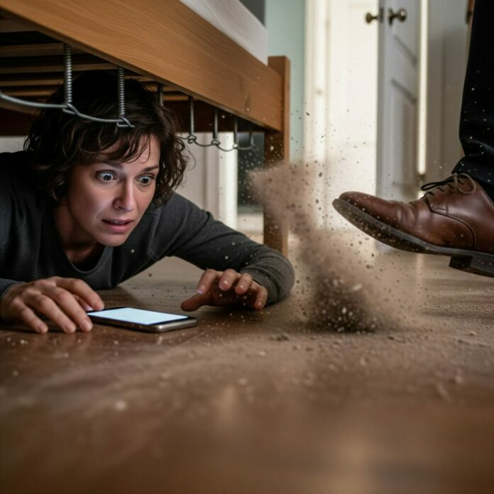 Inside, I moved silently to my bedroom and slipped under the bed, pulling the comforter low enough to conceal me. My heartbeat thudded so loudly it echoed in my ears. Hours crawled by. Dust tickled my throat. My phone felt like a warm brick in my pocket, and I prayed it wouldn’t vibrate.