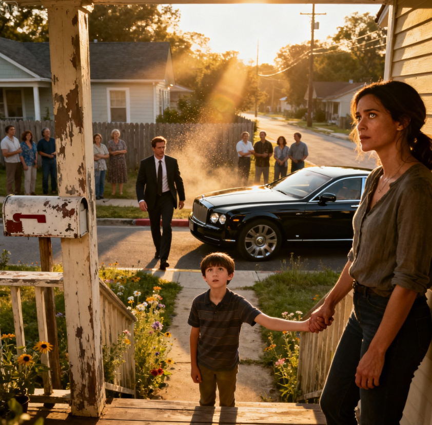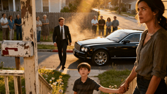 People peeked through their windows. Sophia froze as a tall man in a gray suit stepped out. His eyes locked on hers — familiar, intense, and filled with disbelief.