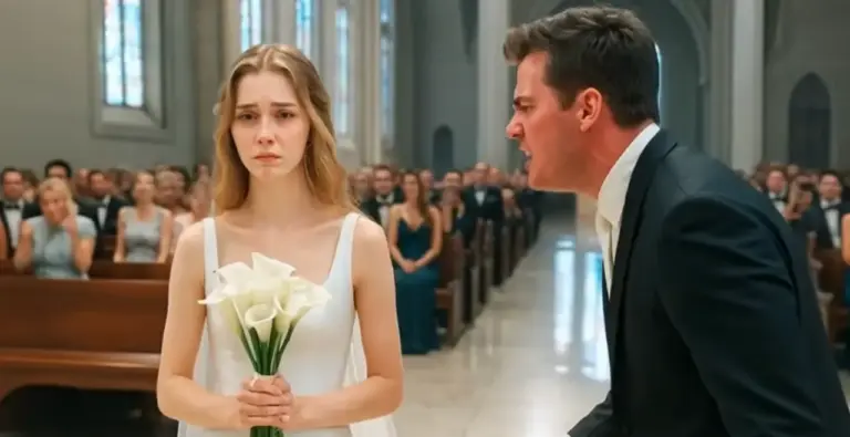 The church smelled of lilies and wax, but the air felt heavy, like it was pressing down on her chest. Her plain white gown, no frills or lace, clung to her frame, chosen because it felt honest, not because it screamed wealth. Her dark hair, pulled back simply, framed a face that carried no makeup, just the raw flush of shame.