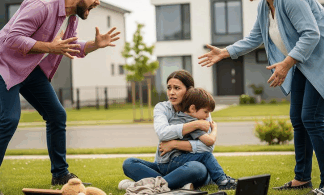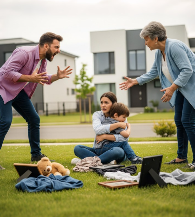 The wind tore through the open yard as I stepped out of my car, my stomach tightening at the sight before me. Clothes — my daughter’s dresses, jeans, and my grandson’s tiny shirts — were scattered across the front lawn like fallen leaves. Family photos, some shattered, lay face down in the dirt. I froze. Then I heard the shouting.