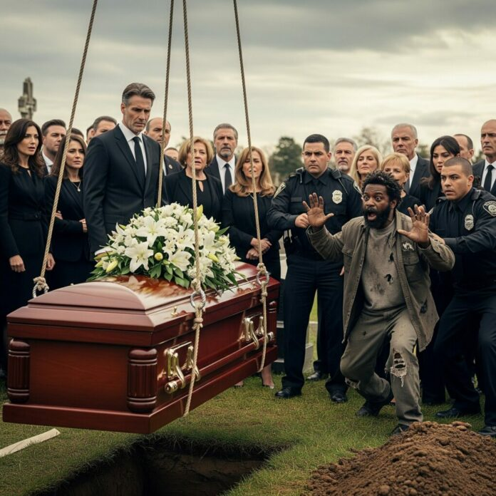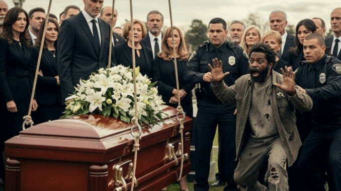 Heads turned. Gasps rippled through the mourners as a homeless man pushed past the crowd, stumbling toward the grave. His clothes were torn, his beard unkempt, and yet his eyes blazed with certainty. His name was Benjamin Carter, a man most of the city ignored on the streets.