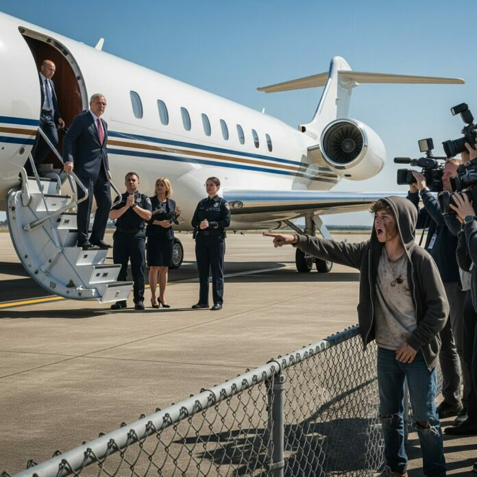 The words cut through the crisp air like a blade. Everyone froze. Heads turned toward the chain-link fence near the edge of the runway. A boy stood there, no older than twelve, his hoodie torn, his jeans dirty, sneakers ripped at the toes. His dark hair stuck out in messy strands, and his face was smudged with dust. But his eyes—wide, terrified, unblinking—were locked on Alexander.