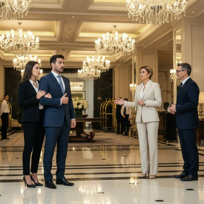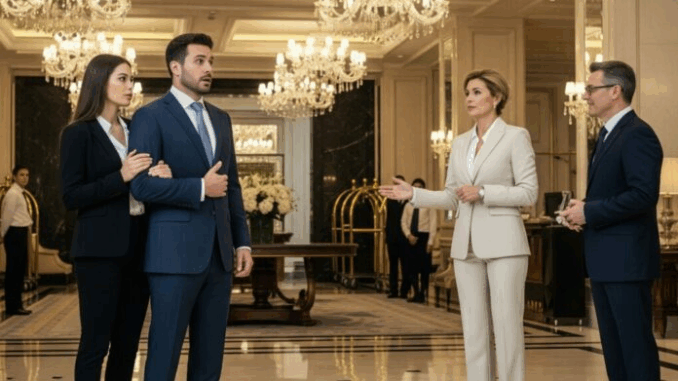 Across the room, walking with quiet authority, came Celeste Cortez, his wife. Only she wasn’t the heartbroken woman he had ignored for years. She wore a cream suit that radiated elegance, her steps firm, her presence undeniable. Staff whispered in hushed tones, heads turning as realization spread across the lobby. Adrien froze, his hand trembling on the desk.
