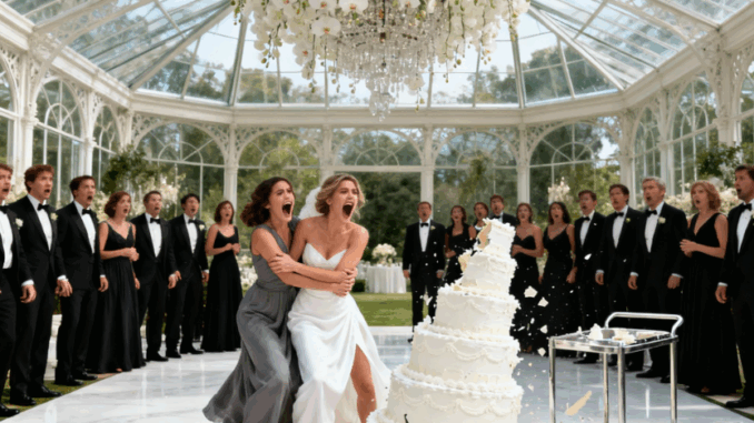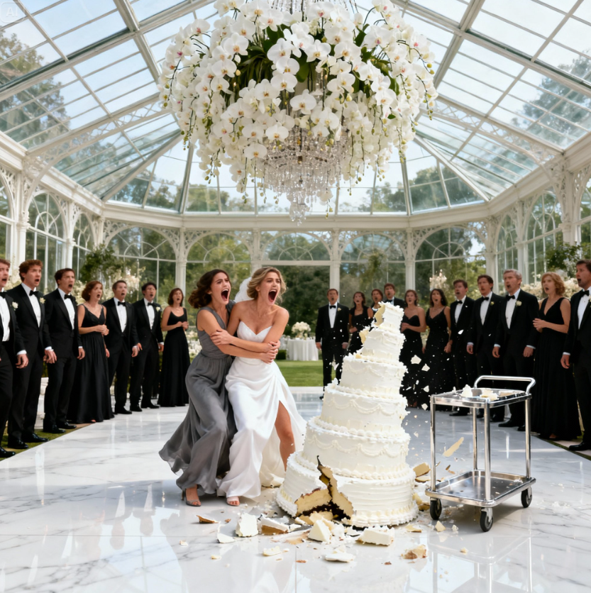 The sound was cataclysmic. The seven-story tower wobbled for a second and then crashed down onto the marble floor. Porcelain shattered. Layers of sponge and cream exploded outward, splattering the guests in the front row. Gold leaf and white icing covered my dress and David’s expensive tuxedo.