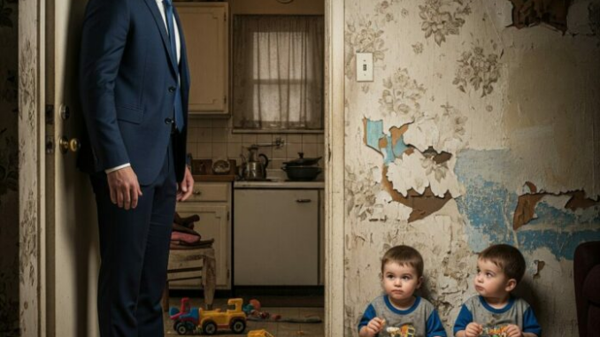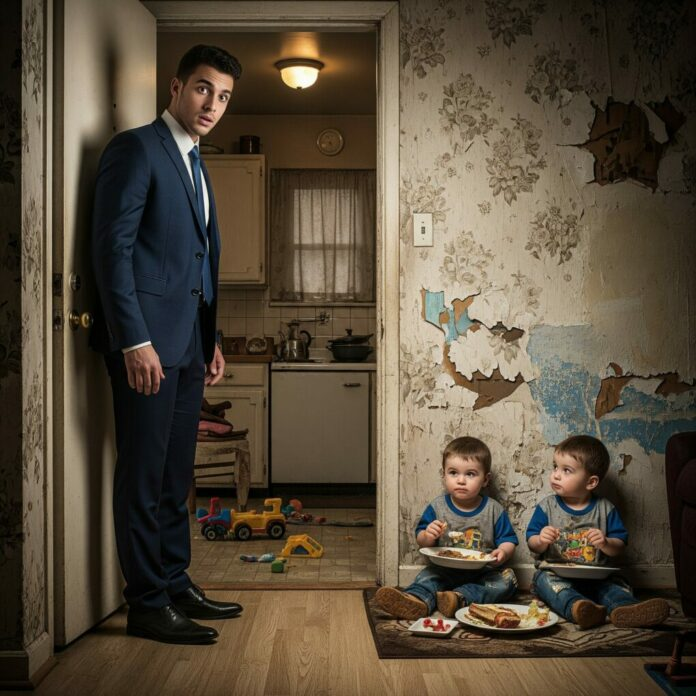 The next evening, determined to confront her himself, Stephen tracked Olivia to her small apartment in one of Chicago’s poorer neighborhoods. The hallway’s peeling wallpaper, the dim light, the worn furniture—it was a far cry from the elegant restaurant. As he reached the kitchen, he froze. Two young boys sat happily eating the very leftovers he had seen on camera. His anger vanished, replaced by shock.