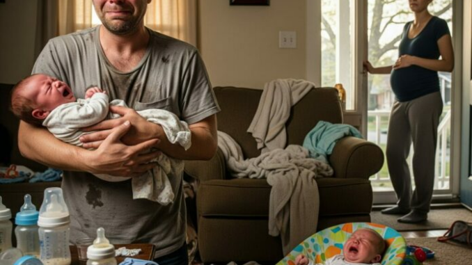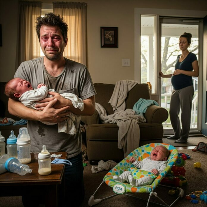Mark stood in the middle of the room, shirt stained with spit-up, trying to hold one screaming baby while the other kicked on the couch. Bottles littered the kitchen counter. The diaper bag lay overturned like it had been searched in a robbery. Mark kept whispering, “Please, buddy… please stop crying…” his voice trembling.