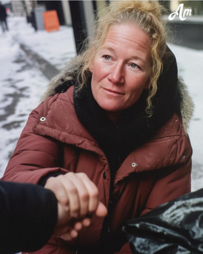 The woman sat on the corner, bundled in mismatched clothes, her thin frame trembling in the cold. She couldn’t have been older than forty, but life had clearly taken its toll.