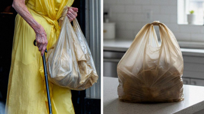 She walked slowly, wearing her old blue dress pressed neatly but visibly worn. Her hair was pinned back in a simple clip, her shoes didn’t match, and in her hands, she clutched a faded cloth bag with frayed corners and a stain near the zipper.