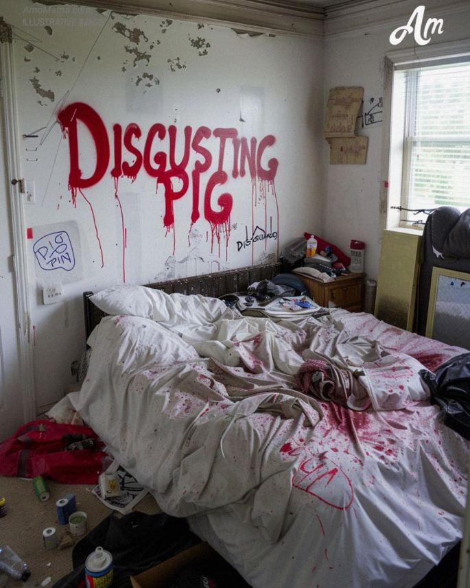 We were out of town for the weekend, our first real vacation in months. When we came back, the door was unlocked. Nothing stolen, but everything… ruined. Our bed was slashed open, furniture flipped, and my makeup was poured all over the floors. And on the walls, written in red spray paint, three words I can’t unsee: