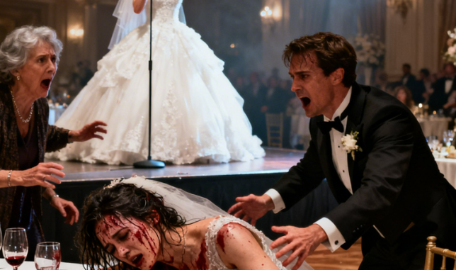 She floated from table to table, laughing too loudly, touching her belly in a way that looked practiced even though there was nothing there. She posed for photos with her hand on her hip, chin lifted, train spread out behind her like she was the bride.